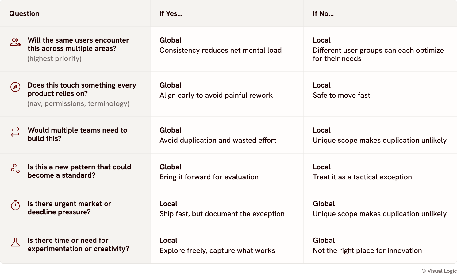 The spectrum shows where common scenarios land on the continuum between local and global. But when you’re in the middle of a roadmap debate, you need something more concrete. That’s where this decision chart comes in—it helps you walk through the actual tradeoffs in real time.