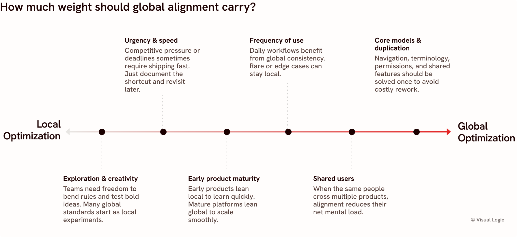 - Global optimization: Designing for the larger system and future. Creating shared models, language, and patterns that reduce cognitive load across products and over time.